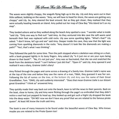 Open to children living in Mayo, aged 9-12 years, this writing contest was a joint effort of Mayo Sailing Club (Rosmoney), Books@One (Louisburgh) and The Mayo News (Westport). The assignment was to create a short story, poem, or a short graphic story using drawing or photographs. The central theme was Clew Bay, and as you can read from Hailey's story, she made the most of that theme with her wonderful story entitled 'The Secrets that Lie Beneath Clew Bay'.